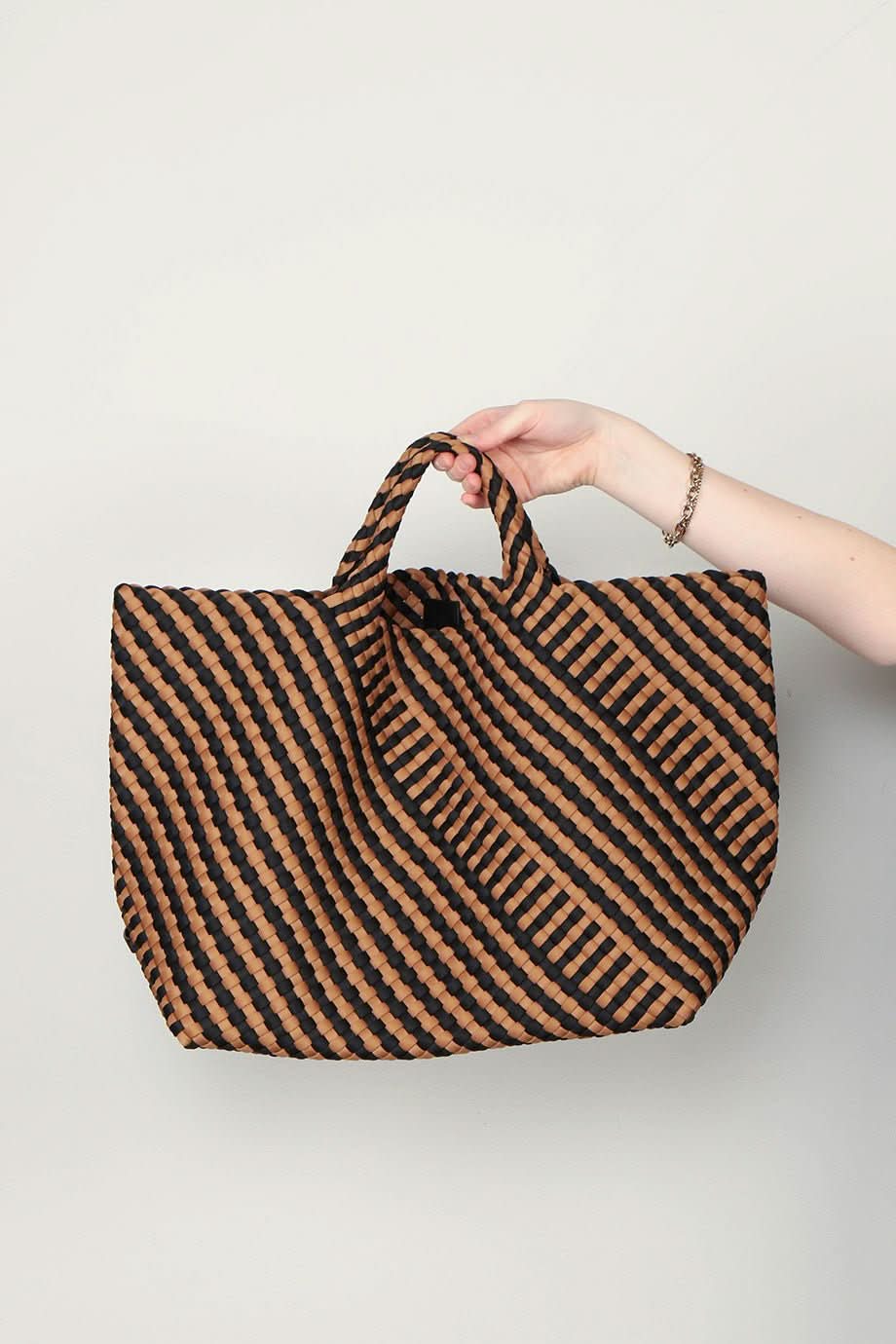 Tas van Naghedi in de kleur Bruin Stofsamenstelling: 100% handgeweven neopreen Handvaten aan bovenzijde Lange strap Logo op de zijkant Inclusief bijpassend geweven tasje met rits Afmetingen: lengte: 55,88 cm, hoogte: 31,75 cm, diepte: 20,32 cm Over Naghedi Naghedi ontwerpt tassen, welke makkelijk in gebruik zijn en stijlvol! Perfect om mee te nemen en alles in te doen. Onderweg naar de gym, een dagje shoppen of op vakantie? Look no further!