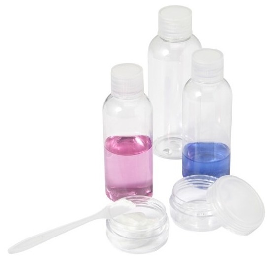 2x Navulbare reisflesjes/reisflacons 6-delige set in transparante etui. Deze reisset bestaat uit twee flesjes a 100ml, twee flesjes a 50ml en twee containers a 10ml. Inclusief een kleine lepel. Afmeting etui: ca. 20 x 19 x 3,3 cm. Handbagage accessoires reisflesjes transparant voor in het vliegtuig. U ontvangt 2 6-delige reissetjes.