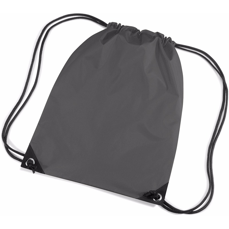 Nylon gymtas in het donkergrijs (antraciet) van waterafstotende stof en reigkoord. Inhoud: 12 liter. Afmeting: 45 x 34 cm.