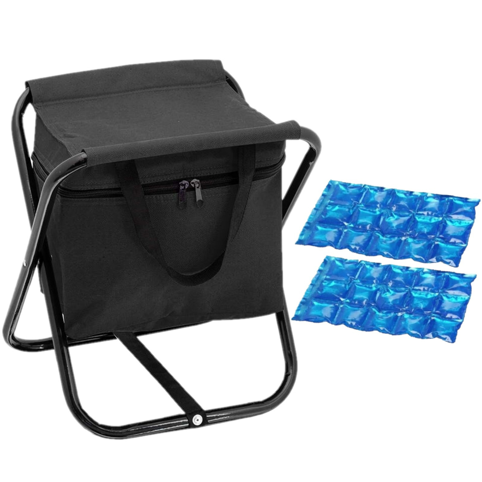 Opvouwbare stoel met koeltas zwart met 2 stuks flexibele koelelementen. De flexibele koelelementen zijn herbruikbaar. Afmeting stoel met koeltas: ca. 26 x 34 x 32 cm. Materiaal koeltas: polyester, aluminium. , Dit artikel bestaat uit:, 2x 1x Stuks herbruikbare flexibele koelelementen icepack 15 x 25 cm, 1x Opvouwbare stoel met koeltas zwart 26 x 34 x 32 cm