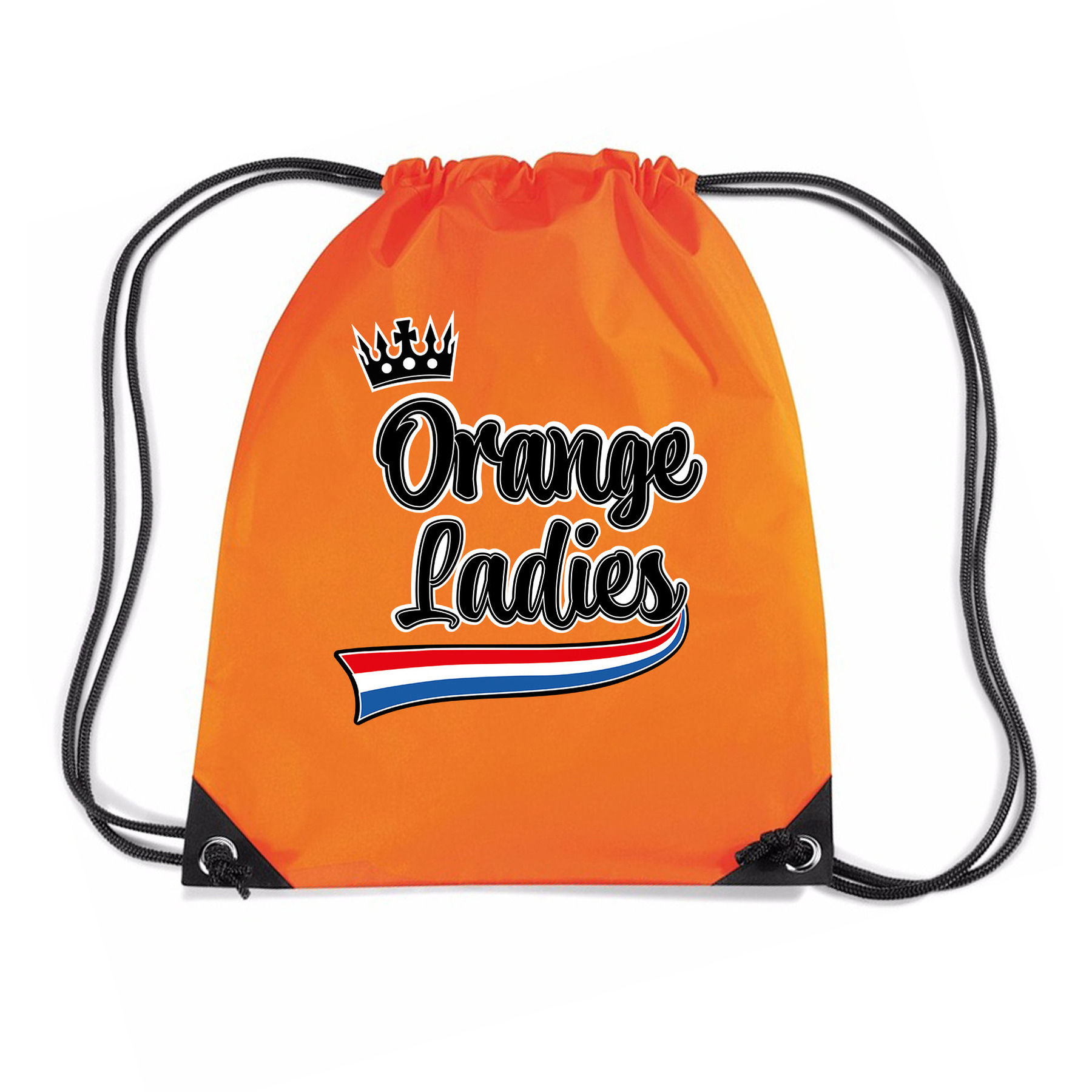 Bellatio Decorations oranje rugzak met rijgkoord. Rugtas bedrukt met de tekst: Orange Ladies, een kroontje en de Nederlandse vlag. Leuk voor Koningsdag, EK/WK of een ander evenement waarbij het Nederlands elftal moet spelen. Materiaal: waterafstotend polyester. Formaat: ca. 45 x 34 cm. Inhoud: ca. 11 liter.