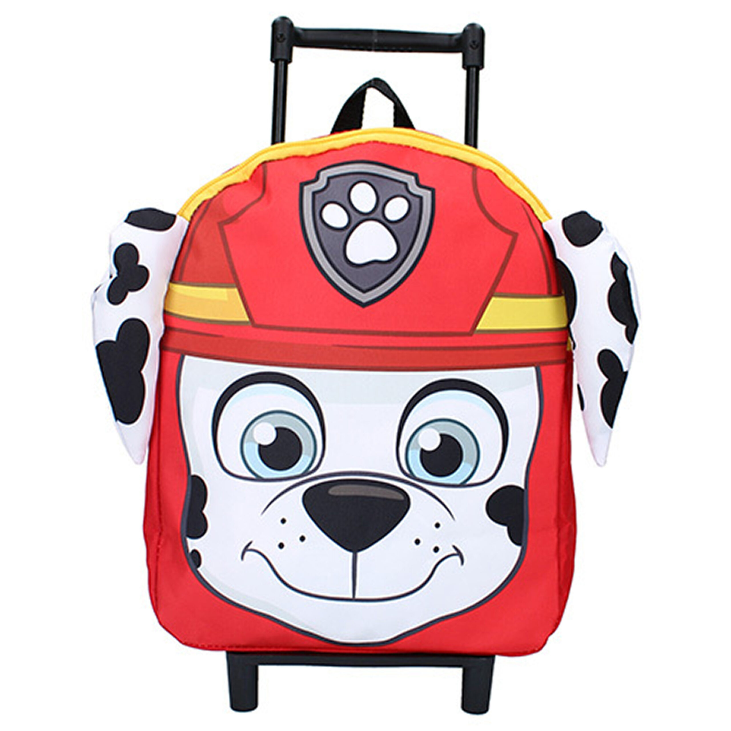 Paw Patrol thema Marshall reiskoffer/trolley/rugtas rood 33x 25 cm voor kinderen. Handige reiskoffer voor wanneer kinderen uit logeren gaan, of gebruik hem als schooltas. De trolley heeft twee wieltjes en een uittrekbaar handvat om de tas mee te trekken. Ook is de tas voorzien van verstelbare schouderbanden, zo kan de tas zowel op de rug gedragen worden als rollend over de grond. Materiaal: polyester. Afmeting indien handvat ingeschoven 33 x 25 x 11 cm. Aantal vakken: 1.