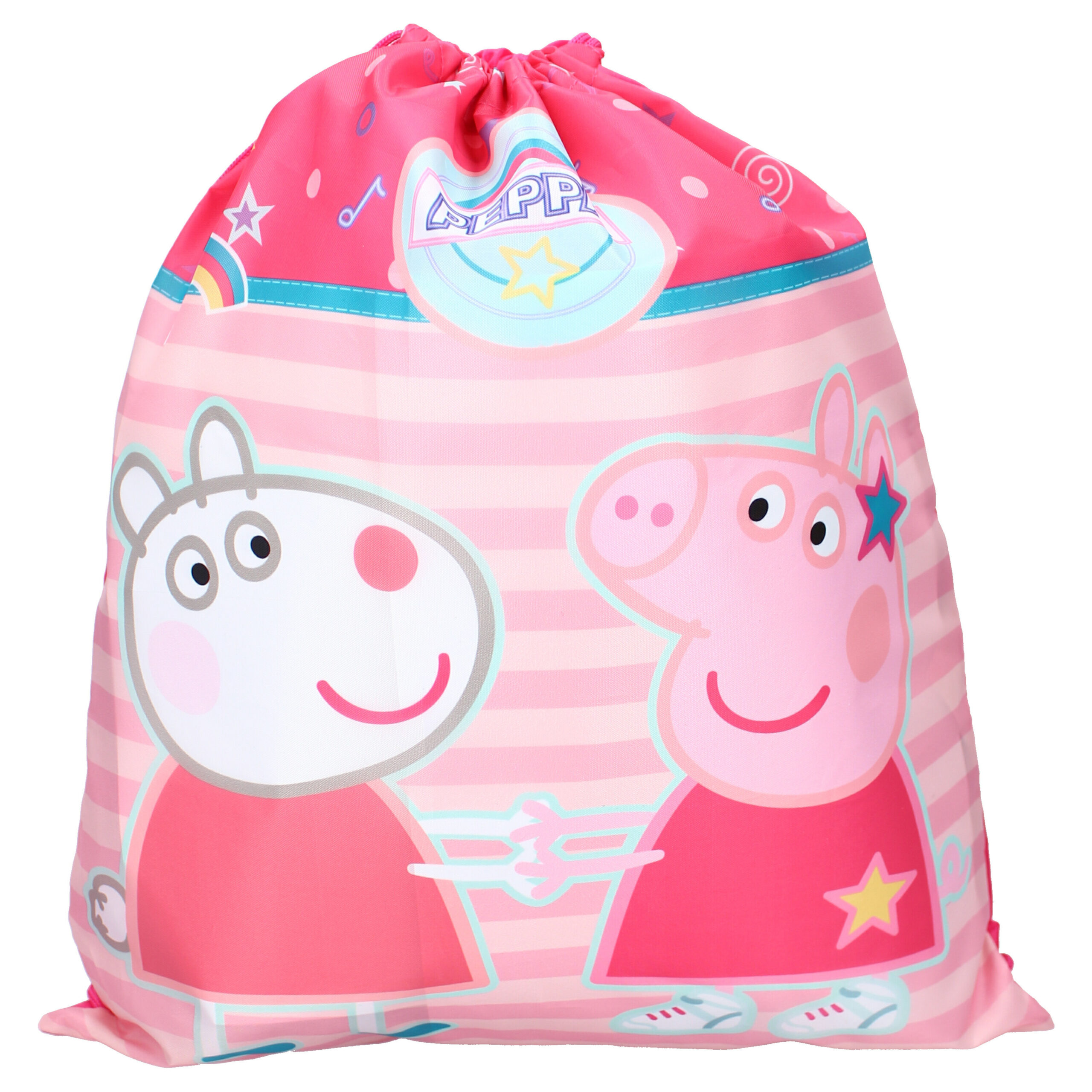 Peppa Pig gymtas/rugzak/rugtas roze voor kinderen met koordjes (treksluiting). Handige lichtgewicht rugzak, ideaal voor de gym of als lunchtas voor naar school. Afmeting: ca. 44 x 37 cm. Materiaal: polyester. Aantal vakken: 1.