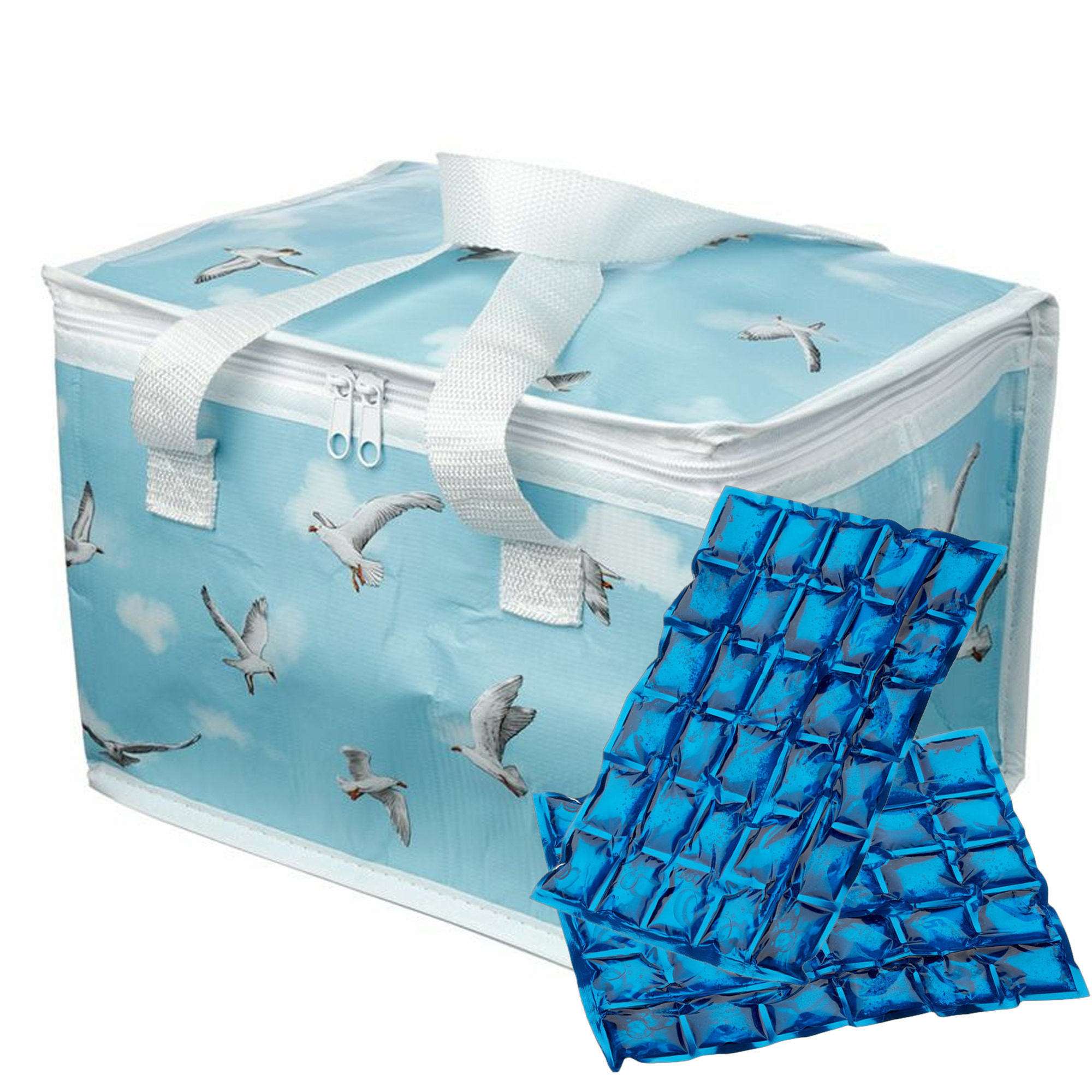 Handige lunch koeltas met 2x flexibel koelelement, Zeemeeuw thema print om uw lunch of six-pack blikjes koel te houden. Afmetingen: 20 x 29 x 20 cm. Inhoud ca. 12 liter. Materiaal: polypropyleen. , Dit artikel bestaat uit:, 2x Flexibele koelelementen – 24 x 29 cm – 1x stuks – Flexibel koelkussen voor koelbox of koeltas, 1x Kleine lunch koeltas Zeemeeuw print 20 x 29 x 20 – 11.6 liter