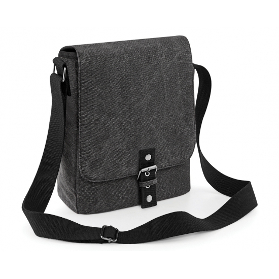 Vintage canvas schoudertas in het antraciet. Deze schoudertas met verstelbare schouderriem bevat een speciaal vak om uw IPad of tablet veilig mee te kunnen nemen. De schoudertas is gemaakt van gewassen canvas en heeft een formaat van ongeveer 23 x 28 x 7 cm. Inhoud is ongeveer 5 liter. 352 grams.