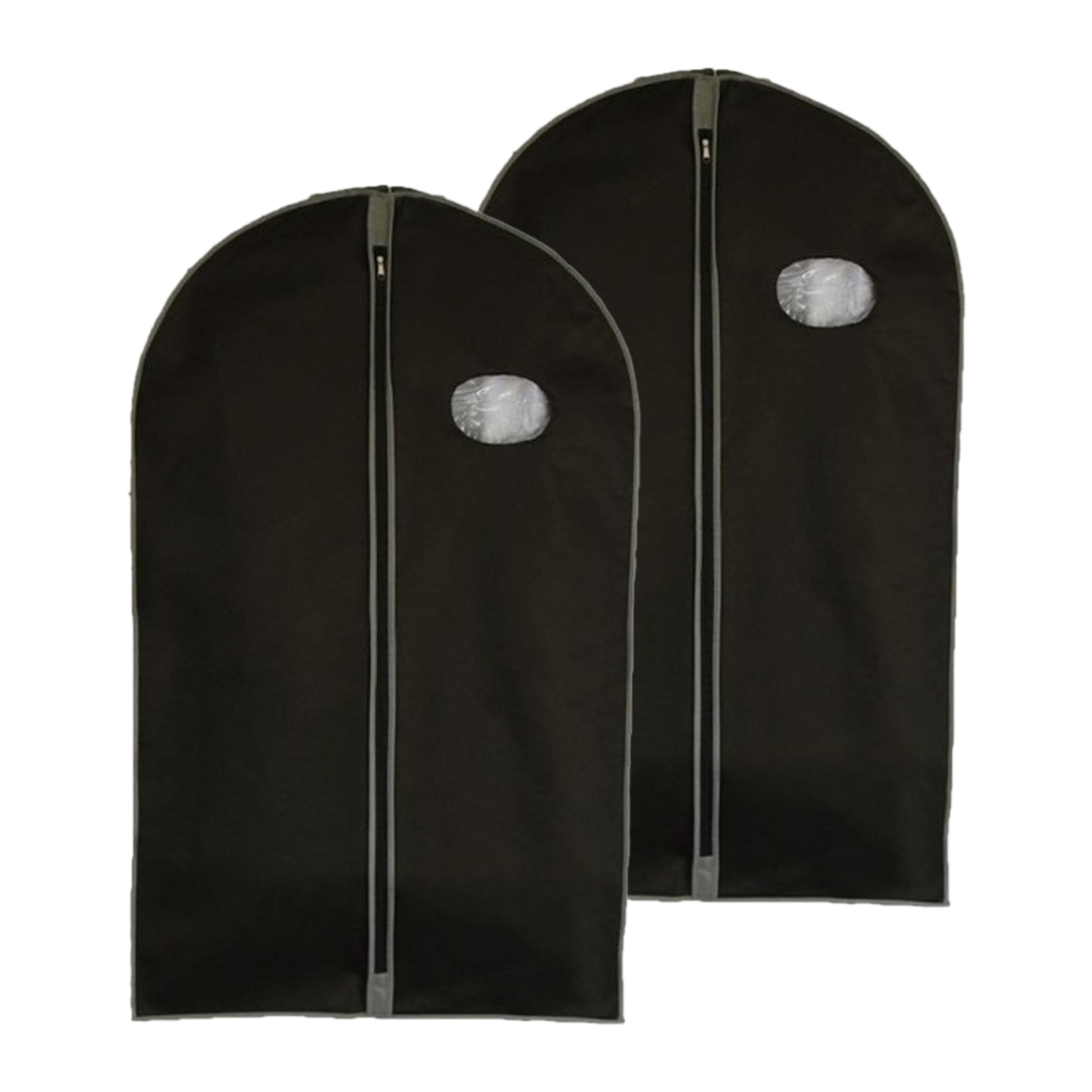 2x stuks zwarte reis en/of bescherm kledinghoes met rits. Kledinghoes om uw kleding netjes te houden of op een nette manier te vervoeren. In de hoes zit een doorzichtig paneel zodat u kun zien wat erin zit. De hoes heeft contrasterende biezen. Formaat van de hoes is ongeveer 100 x 60 cm. Materiaal: niet geweven polypropyleen.