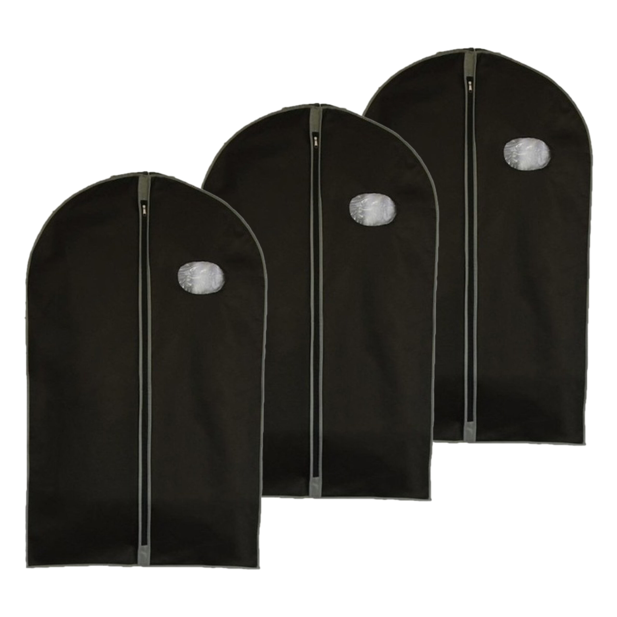 3x stuks zwarte reis en/of bescherm kledinghoes met rits. Kledinghoes om uw kleding netjes te houden of op een nette manier te vervoeren. In de hoes zit een doorzichtig paneel zodat u kun zien wat erin zit. De hoes heeft contrasterende biezen. Formaat van de hoes is ongeveer 100 x 60 cm. Materiaal: niet geweven polypropyleen.