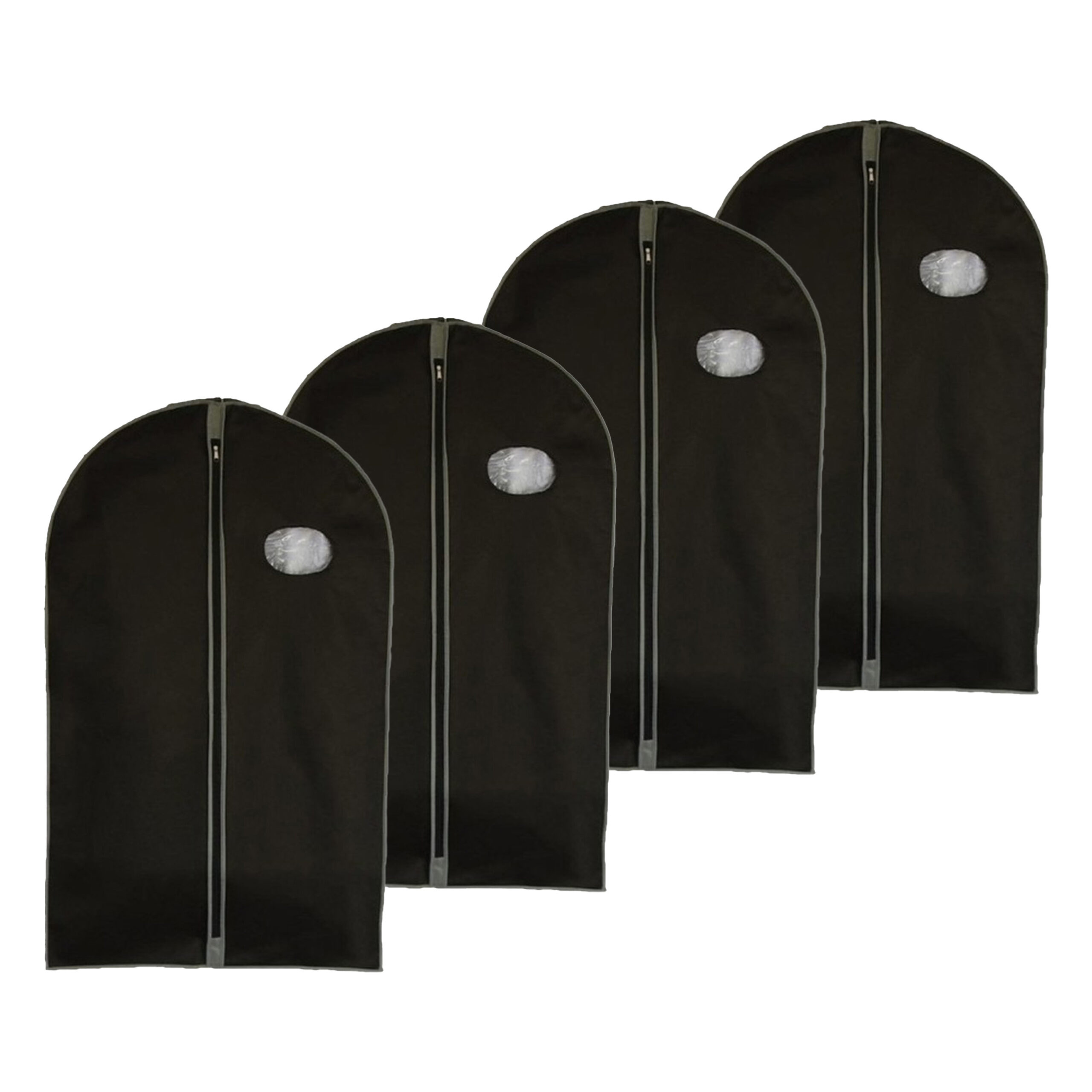 4x stuks zwarte reis en/of bescherm kledinghoes met rits. Kledinghoes om uw kleding netjes te houden of op een nette manier te vervoeren. In de hoes zit een doorzichtig paneel zodat u kun zien wat erin zit. De hoes heeft contrasterende biezen. Formaat van de hoes is ongeveer 100 x 60 cm. Materiaal: niet geweven polypropyleen.