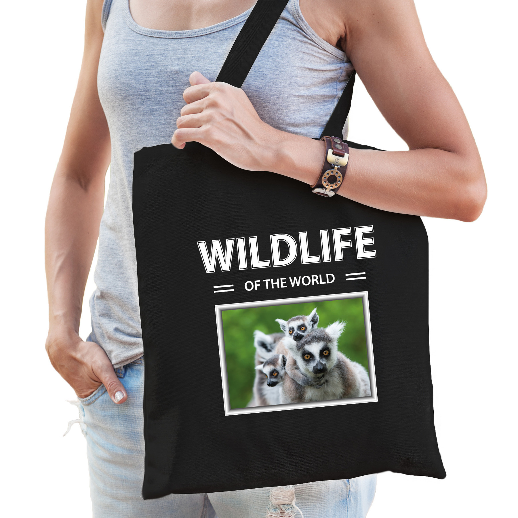 Ringstaart maki tasje zwart voor volwassenen en kinderen. Op deze tas staat een Ringstaart maki afbeelding en de tekst: wildlife of the world. Een musthave voor een echte dieren/ Ringstaart maki liefhebber of iemand die alles van Ringstaart makis spaart. Erg leuk om cadeau te doen aan een echte Ringstaart maki fan of gewoon om zelf te gebruiken!