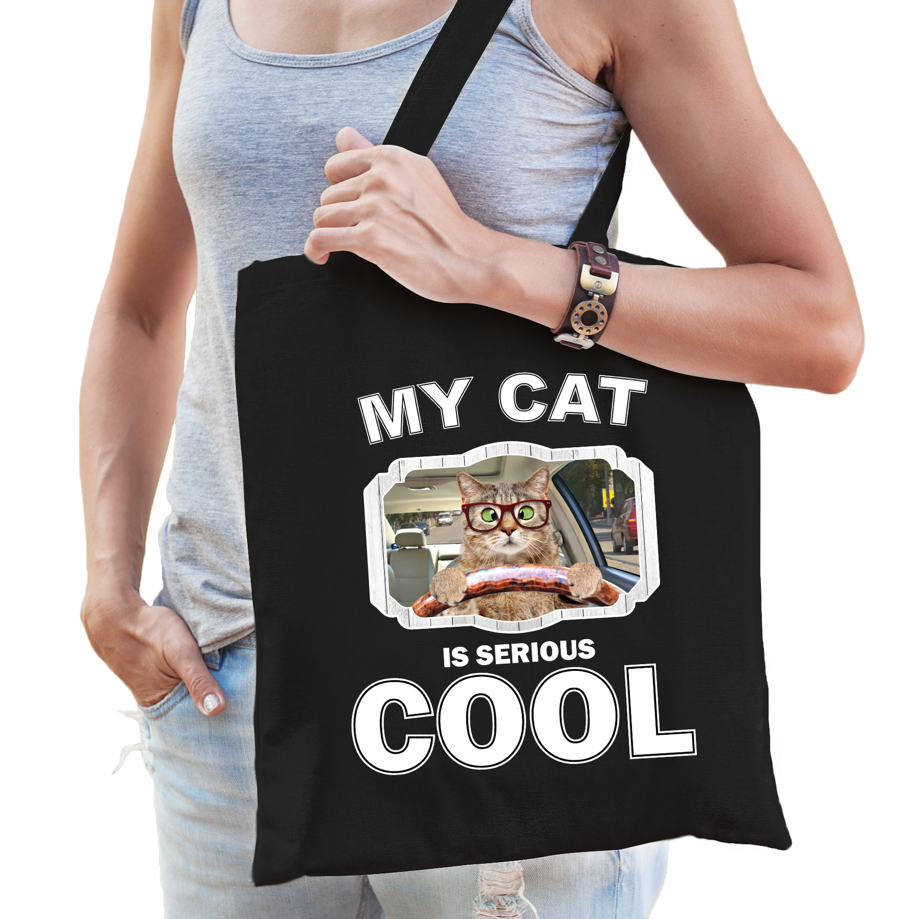 Bruine kat katten tasje zwart volwassenen en kinderen – my cat serious is cool kado boodschappentasj