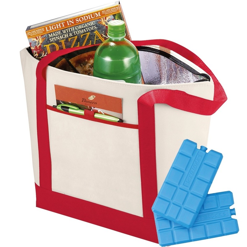 Opvouwbare rood/naturel draag koeltas met ritssluiting en dubbele handgreep + 4 koelelementen. De koelelementen zijn ongeveer 200 cc(15 x 8 x 2 cm). De koeltas heeft ook een zijvakje en een formaat van 44 x 34 x 15 cm. Materiaal: polypropyleen.