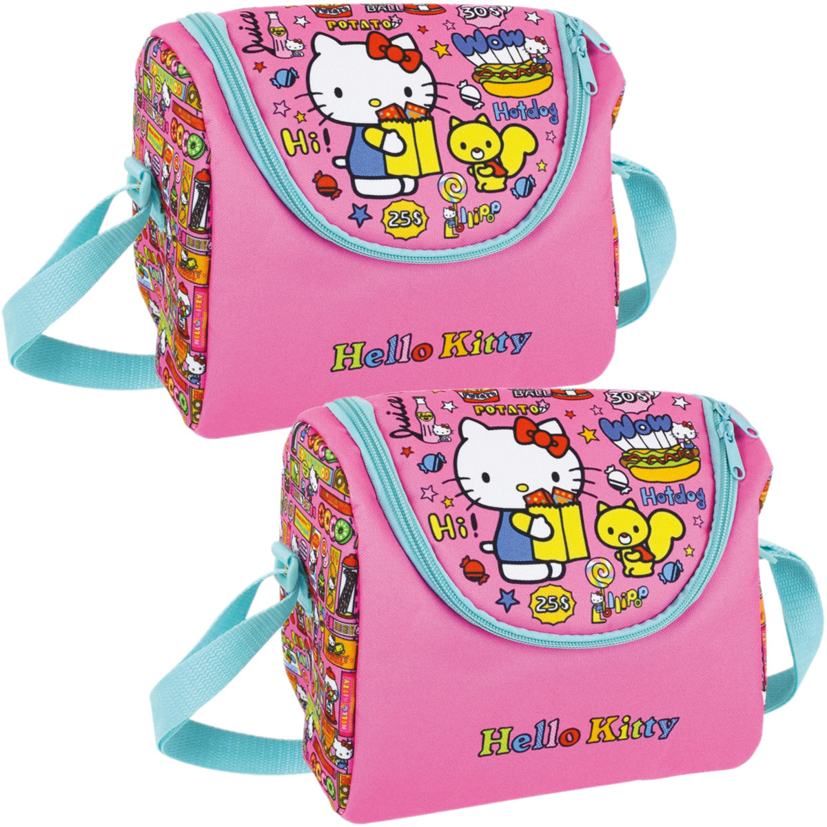 Set van 2x stuks handige koeltassen voor kinderen roze met Hello Kitty print om de lunch koel te houden. De koeltas bevat een vak met rits, in het vak zit een elastiek bevestigd waarmee je een fles of bidon op z’n plaats kan houden. Afmetingen: 22 x 18 x 13 cm. Inhoud ca. 5 liter. Materiaal: polyester, PVC.