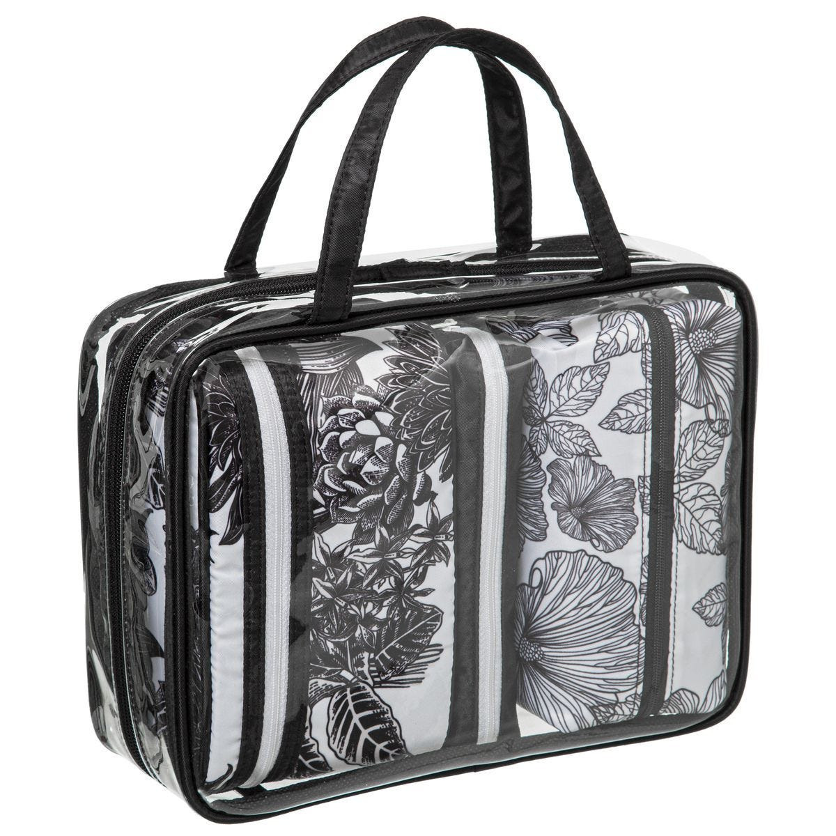 Set van 4x toilettassen/make-up/opberg tasjes bloemenprint zwart/wit. Reis toilettassen in verschillende formaten. Formaat L: 19 x 9 x 12 cm, formaat M: 18 x 8 x 9 cm, formaat S: 18 x 4 x 8 cm, formaat draagtas: 27 x 9 x 20 cm. Materiaal: nylon. Handbagage reis vakantie accessoires toilettassen/make-up tasjes.