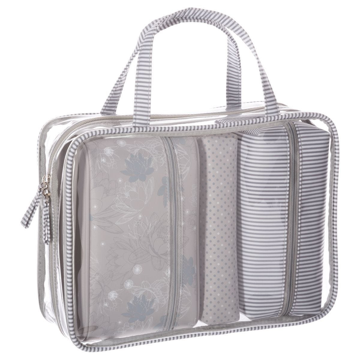 Set van 4x toilettassen/make-up/opberg tasjes grijs met verschillende strepen/bloemen dessins. Reis toilettassen in verschillende formaten. Formaat L: 19 x 9 x 12 cm, formaat M: 18 x 8 x 9 cm, formaat S: 18 x 4 x 8 cm, formaat draagtas: 27 x 9 x 20 cm. Materiaal: nylon. Handbagage reis vakantie accessoires toilettassen/make-up tasjes.