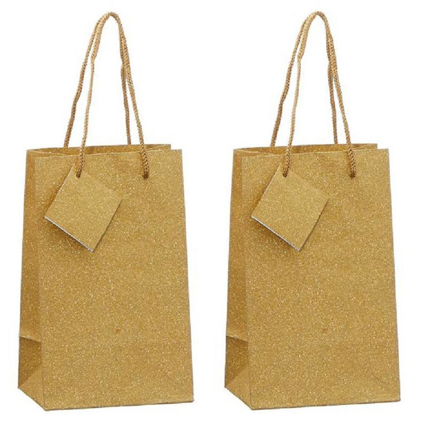 Set van 8x stuks luxe gouden papieren giftbags/tasjes met glitters. De luxe gouden tassen zijn gemaakt van papier en zijn aan alle zijden bekleed met glitters. Aan het koordje hangt een kaartje waar u een persoonlijke tekst op kunt schrijven. Formaat: ongeveer 12.5 x 20 x 9 cm.