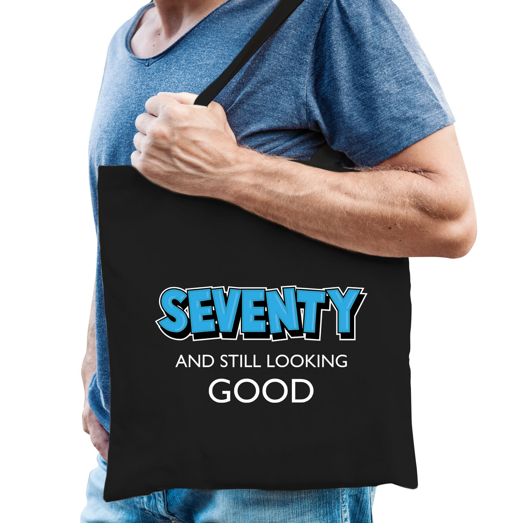 Seventy and still looking good verjaardag cadeau katoenen tas zwart voor heren. Dit zwarte katoenen tasje is eenzijdig bedrukt met blauwe letters en de tekst: Seventy and still looking good. Het cadeau tasje is leuk om cadeau te geven voor iemand zijn 70e verjaardag. Ook leuk om er bijvoorbeeld cadeaus in te doen en die aan de jarige te geven! Formaat vak: 42 x 38 cm. Totale lengte inclusief hengsel: 67 cm. Materiaal: 100% katoen, 130 grams kwaliteit. Inhoud: 10 liter.