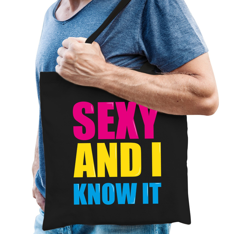 Sexy and i know it fun tekst kado katoenen tas zwart voor heren. Dit zwart katoenen tasje is eenzijdig bedrukt met de tekst: Sexy and i know it.