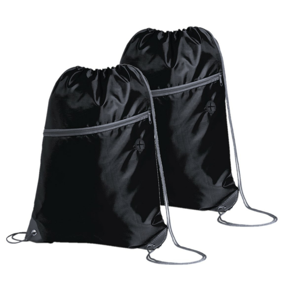 2x stuks sport gymtas/draagtas/rugtas/gymzak in kleur zwart met handig rijgkoord 34 x 44 cm van polyester en verstevigde hoeken. Eenvoudige rugtas voor sport, zwemmen en of voor een festival/carnaval. Deze tas is waterbestendig. Voorvak met ritssluiting en hoofdtelefoonuitgang. Geschikt voor kinderen en volwassenen.