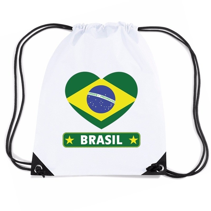 Brazilie hart vlag nylon rugzak wit met rijgkoord, geschikt voor volwassenen en kinderen. Op dit witte rugzakje staat de vlag van Brazilie in een hart. De nylon gymtas is van waterafstotende stof en heeft rijgkoord. De inhoud van de gymtas is ongeveer 11 liter en de afmeting 45 x 34 cm.