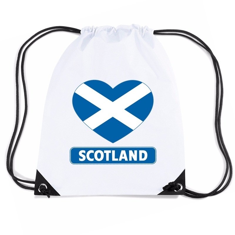 Schotland hart vlag nylon rugzak wit met rijgkoord, geschikt voor volwassenen en kinderen. Op dit witte rugzakje staat de vlag van Schotland in een hart. De nylon gymtas is van waterafstotende stof en heeft rijgkoord. De inhoud van de gymtas is ongeveer 11 liter en de afmeting 45 x 34 cm.