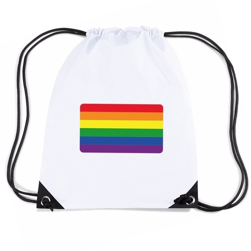 Regenboog nylon rugzak/ sporttas wit met rijgkoord, geschikt voor volwassenen en kinderen. Op dit witte rugzakje staat de vlag van een Regenboog. De nylon gymtas is van waterafstotende stof en heeft rijgkoord. De inhoud van de gymtas is ongeveer 11 liter en de afmeting 45 x 34 cm.