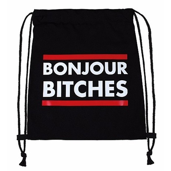 Bonjour Bitches rugtas met rijgkoord. Zwarte rugtas met tekst Bonjour Bitches. De achterzijde van de rugtas is zwart. Materiaal: 100% polyester. Afmeting: ongeveer 38 x 30 cm.