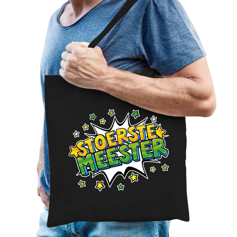 Stoerste meester katoenen tas zwart voor heren. Dit is het perfecte cadeau tasje om meester te bedanken voor zijn aandacht en voor het lesgeven. Een leuk cadeau om meester even in het zonnetje te zetten, omdat hij jarig is of gewoon omdat hij het verdient!