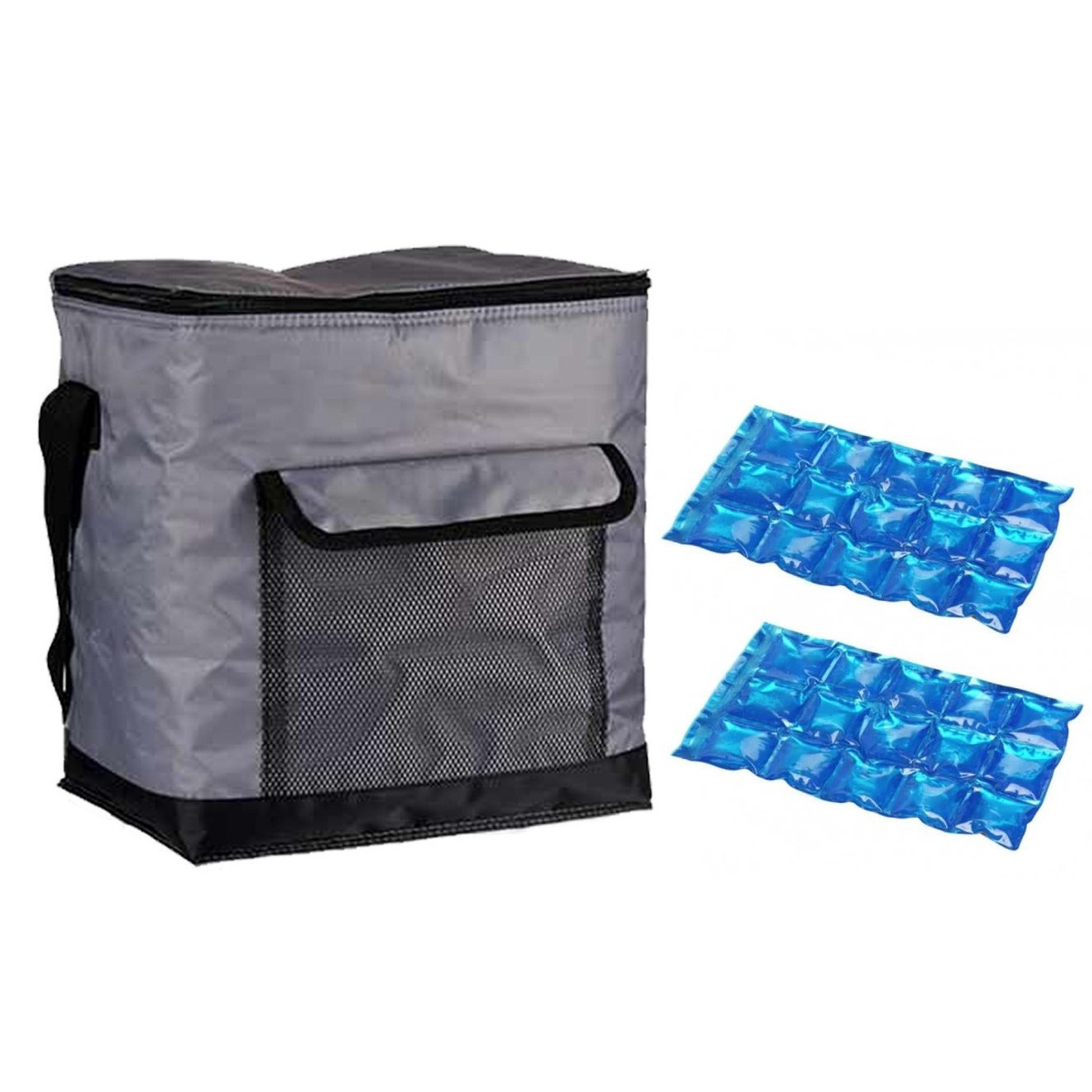 , Dit artikel bestaat uit:, 1x 1x Stuks herbruikbare flexibele koelelementen icepack 15 x 25 cm, 2x Medium Size strand/camping koeltas model Salou – 31 x 23 x 33 cm – 2 vakken – grijs