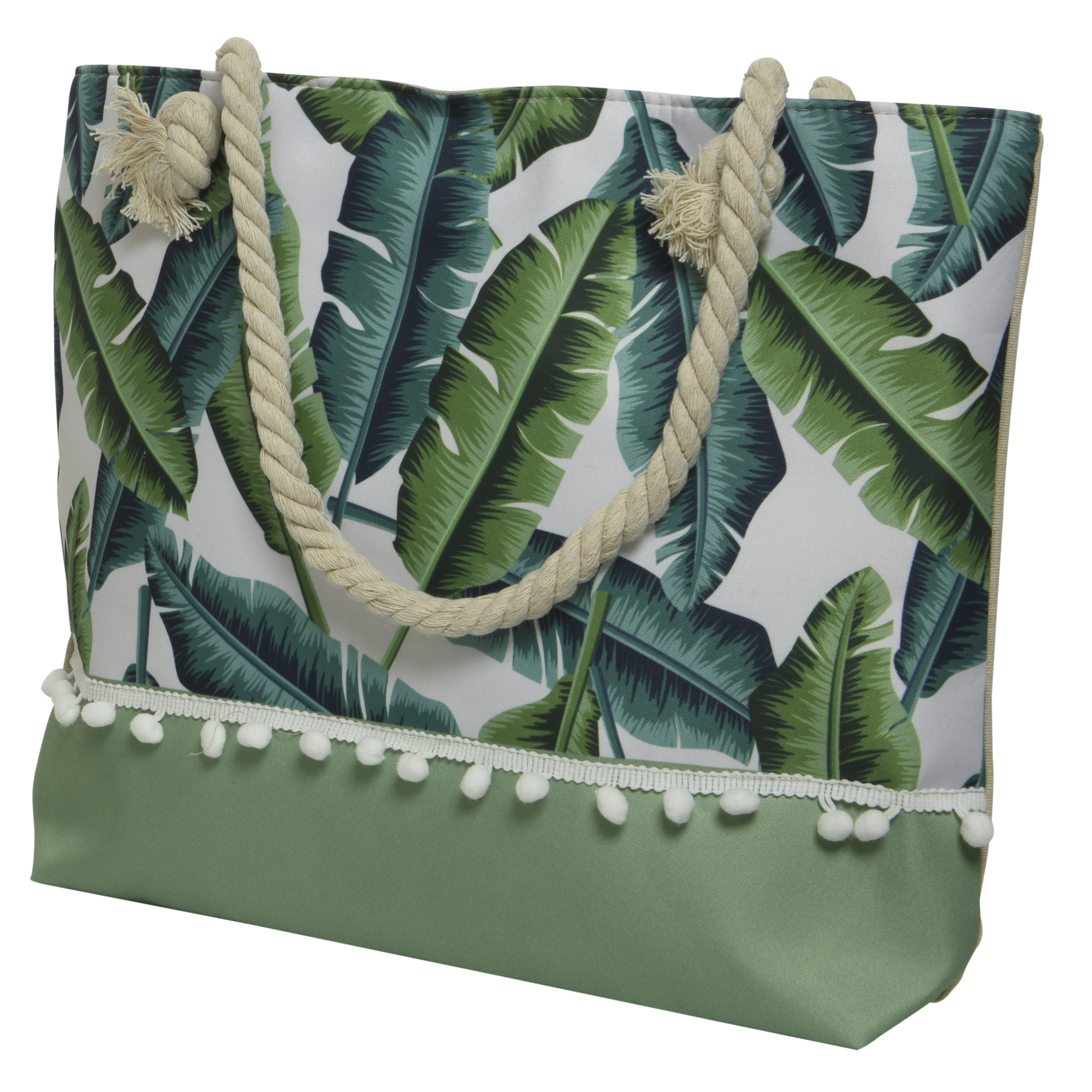 Strandtassen groen met bladeren print/opdruk gemaakt van polyester. Afmeting: 9 x 45 x 35 cm.