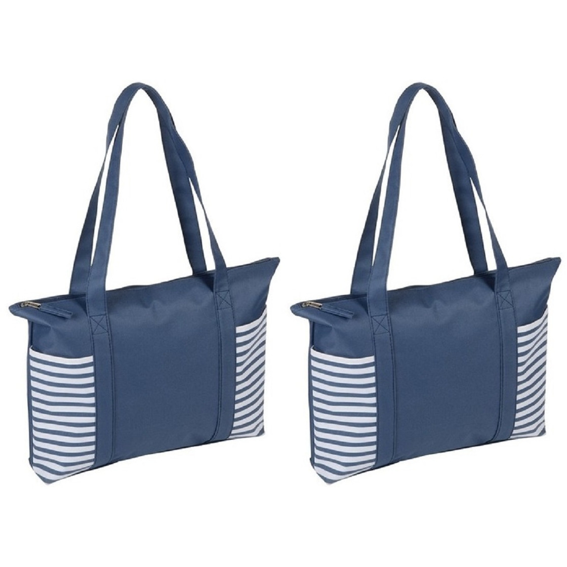 2 stuks strandtas/shopper in het blauw/wit met 2 zijvakken met streepmotief en 2 lange hengsels. Het hoofdvak heeft een ritssluiting. Afmeting ongeveer: 44 x 31,5 x 8,5 cm. Strandartikelen strandtas met streepmotief van polyester met ritssluiting in de kleur blauw/wit.