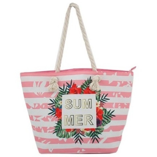 Een roze met witte strandtas met daarop afbeeldingen van bloemen en de tekst Summer. Materiaal: canvas/polyester. Afmeting: ca. L54 x D15 x H38 cm. Lengte hengsel: ca. 30 cm. Inhoud: ca. 30 liter. Sluitbaar met een rits. Strandtassen/schoudertassen roze met wit – Shoppers/zomer tassen.