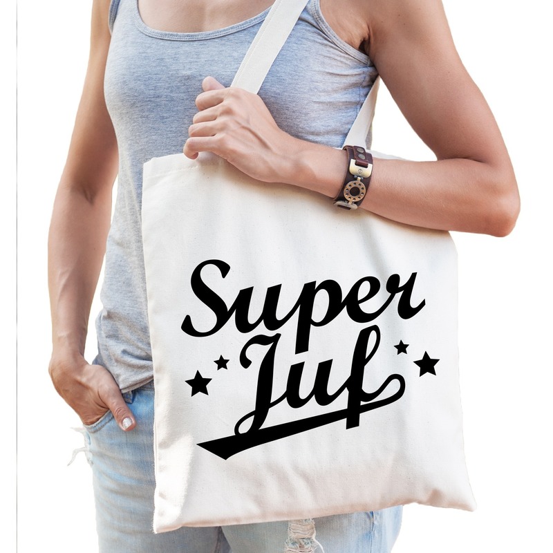 Katoenen tasje super juf. Leuk om cadeau te geven aan de juf aan het einde van het schooljaar, of op meester / juffendag. Dit naturel kleurige katoenen tasje is eenzijdig bedrukt met de tekst super juf.