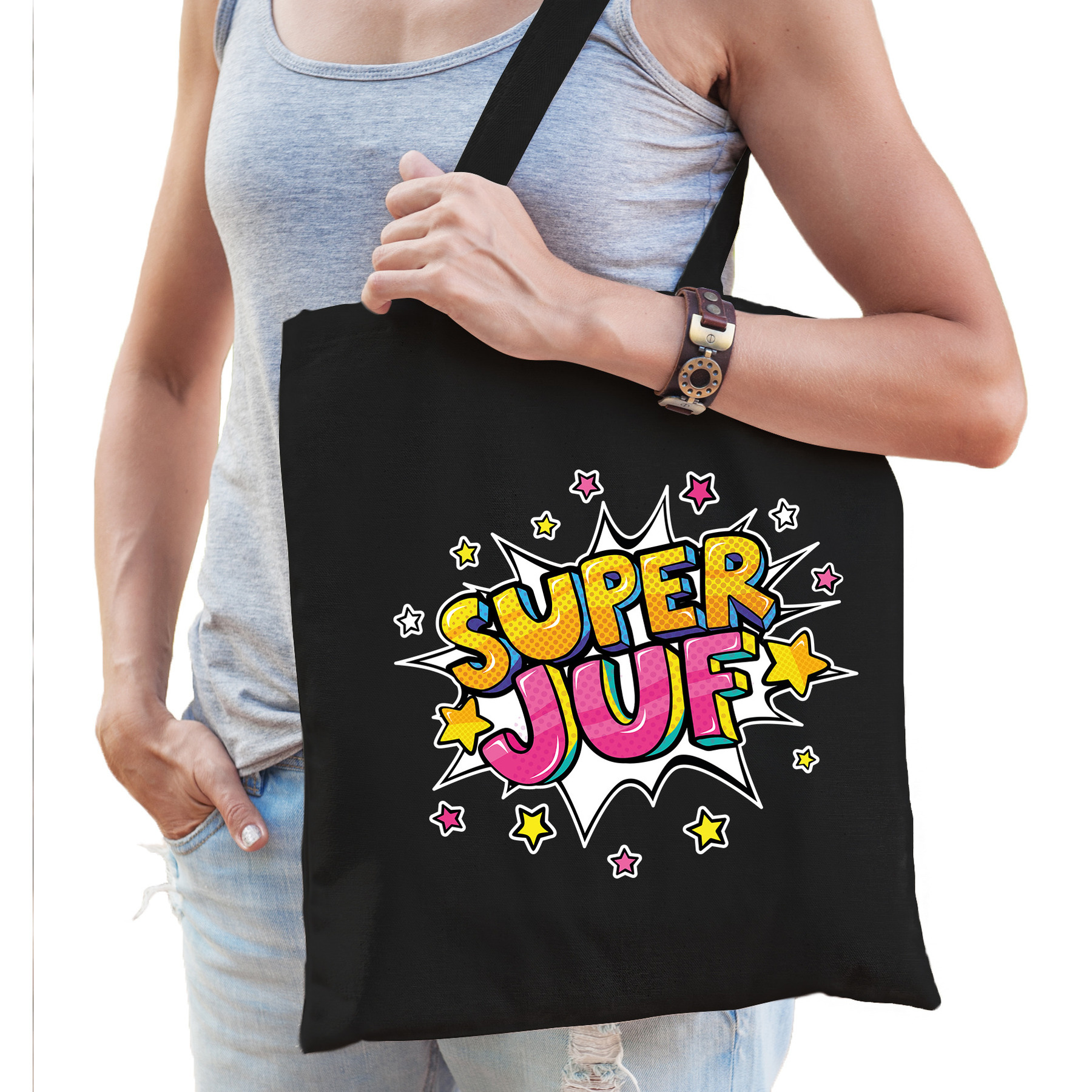 Popart katoenen super juf tas zwart voor dames. Dit zwarte katoenen tasje is eenzijdig bedrukt in gele en roze popart stijl letters met de tekst: Super juf. Dit is het perfecte cadeau tasje om je juf te bedanken voor alles wat zij gedaan heeft. Een leuk cadeau om je juf / docent even in het zonnetje te zetten omdat zij jarig is of gewoon omdat zij het verdient! Formaat vak: 42 x 38 cm. Totale lengte inclusief hengsel: 67 cm. Materiaal: 100% katoen, 140 grams kwaliteit. Inhoud: 10 liter.