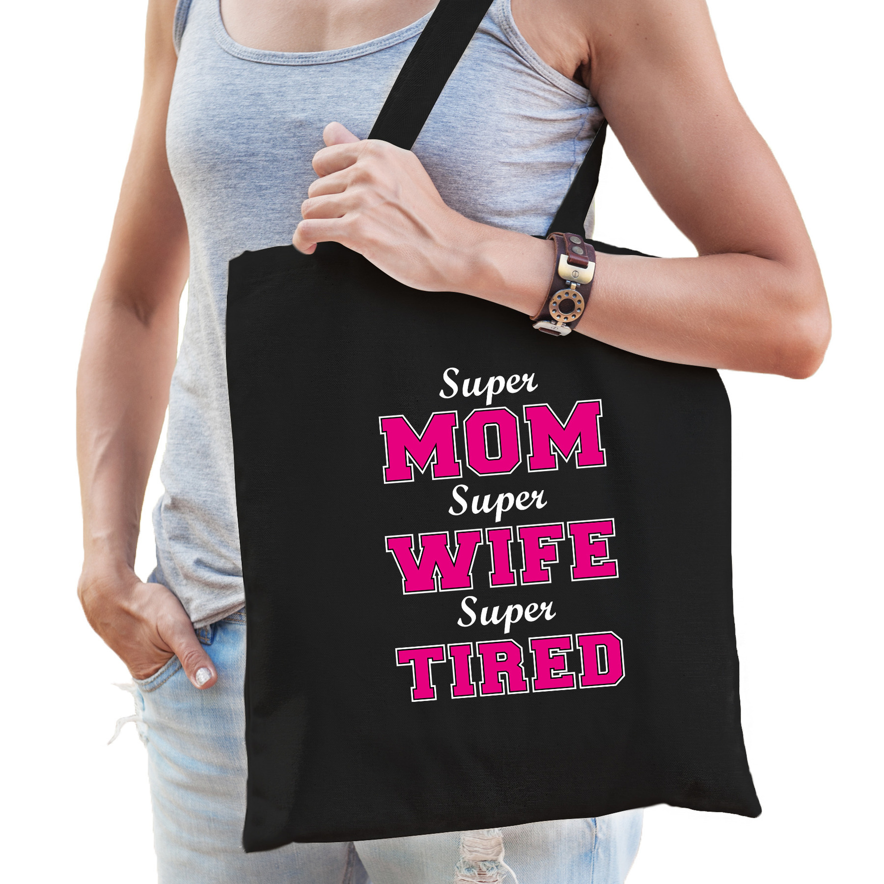 Katoenen moeder kado tasje Super mom wife tired in de kleur zwart. Op dit zwarte tasje staat in roze letters de tekst: Super mom, super wife, super tired. Is jouw moeder een echte supermama? Dan is dit het perfecte cadeautasje om je mama te bedanken voor alles wat zij heeft gedaan. Een leuk cadeau om mama even in het zonnetje te zetten vanwege haar verjaardag of gewoon omdat ze het verdiend heeft!