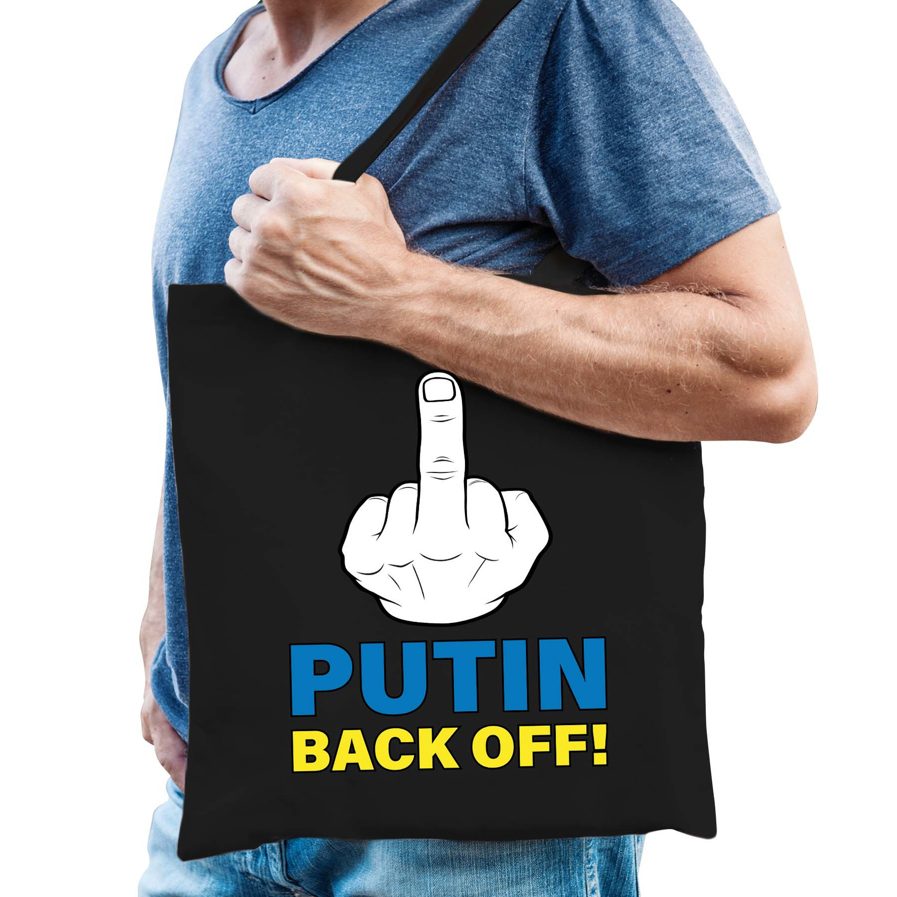 Protest tas Putin back off / middelvinger zwart voor dames en heren. Op dit zwarte tasje staat: Putin back off in de kleuren van de vlag van Oekraine en een middelvinger erboven. Protest/ demonstratie tasje tegen het Oekraiens conflict. Formaat vak: 42 x 38 cm. Totale lengte inclusief hengsel: 67 cm. Materiaal: 100% katoen, 140 grams kwaliteit. Inhoud: 10 liter.
