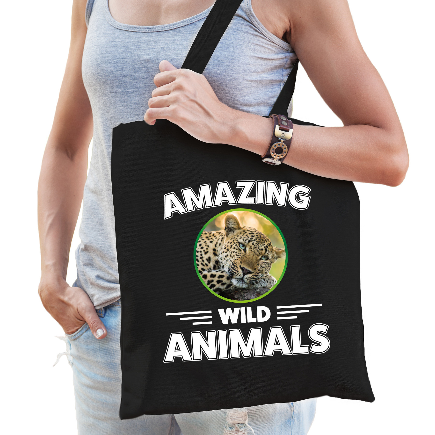 Tasje jachtluipaarden amazing wild animals zwart voor volwassenen en kinderen. Op deze dieren tas staat een afbeelding van een jaguar en de tekst: amazing wild animals. Een musthave voor een echte dieren / jachtluipaarden liefhebber of iemand die alles van jachtluipaarden spaart. Erg leuk om cadeau te doen aan een echte jachtluipaarden fan of gewoon om zelf te dragen!