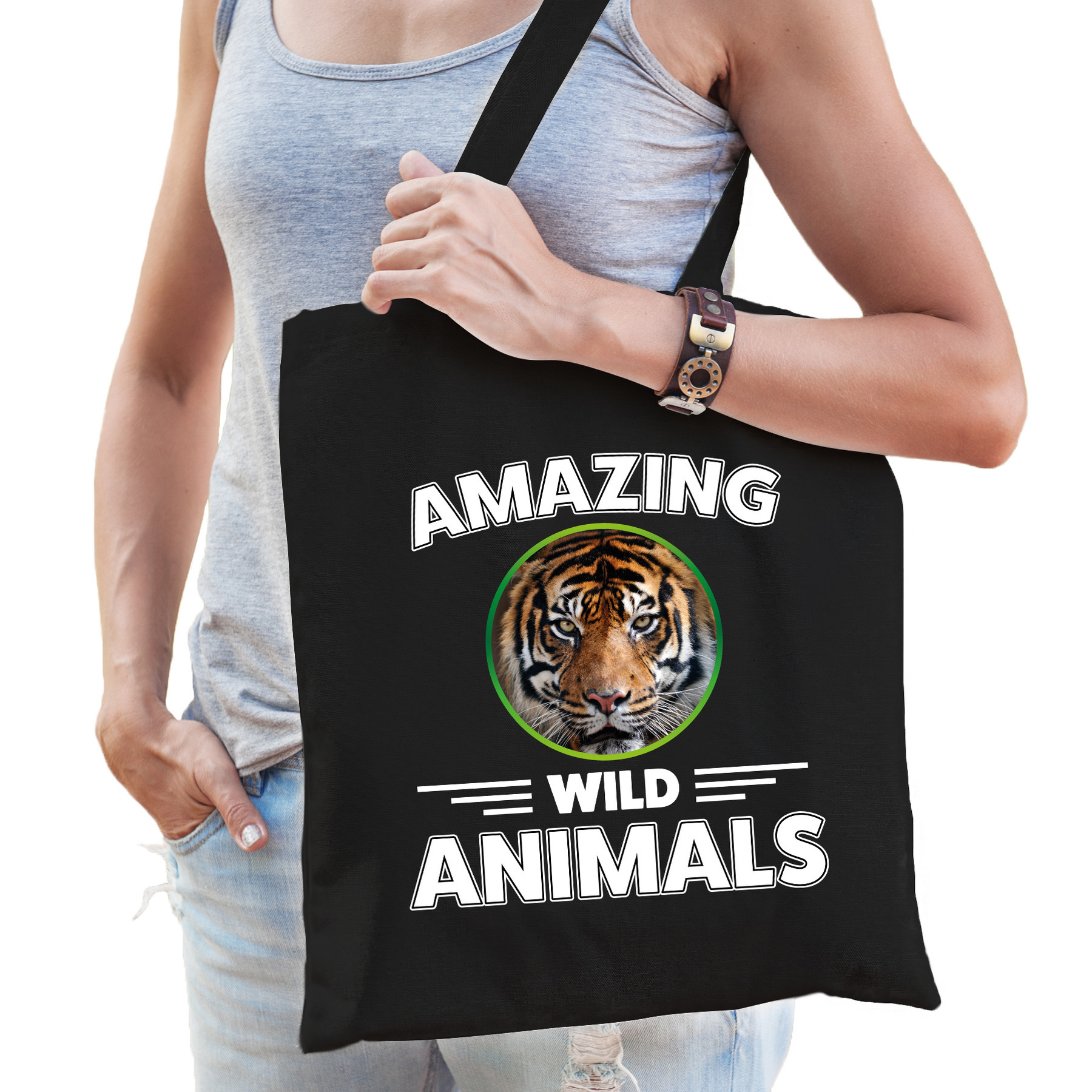 Tasje tijgers amazing wild animals zwart voor volwassenen en kinderen. Op deze dieren tas staat een afbeelding van een tijger en de tekst: amazing wild animals. Een musthave voor een echte dieren / tijgers liefhebber of iemand die alles van tijgers spaart. Erg leuk om cadeau te doen aan een echte tijgers fan of gewoon om zelf te dragen!