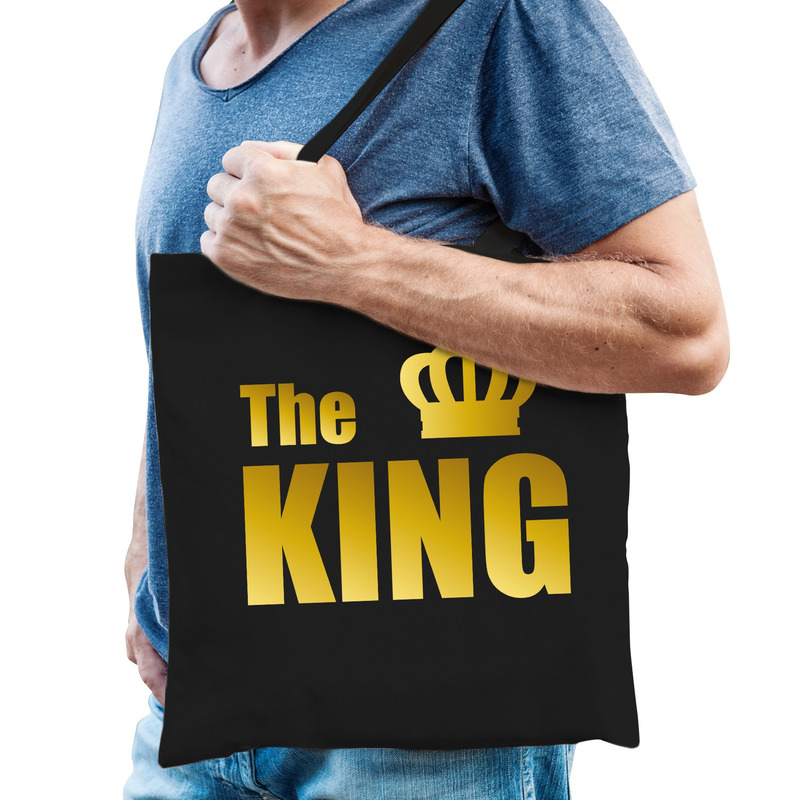 Katoenen tas / shopper zwart met de tekst The king met gouden letters en gouden kroon voor heren. Deze tas / shopper is leuk om cadeau te geven of gewoon om zelf te dragen op bijvoorbeeld Koningsdag of feestgelegenheid met een glamour thema. Dit zwart katoenen tasje is eenzijdig bedrukt met een gouden kroon en de tekst: the king.