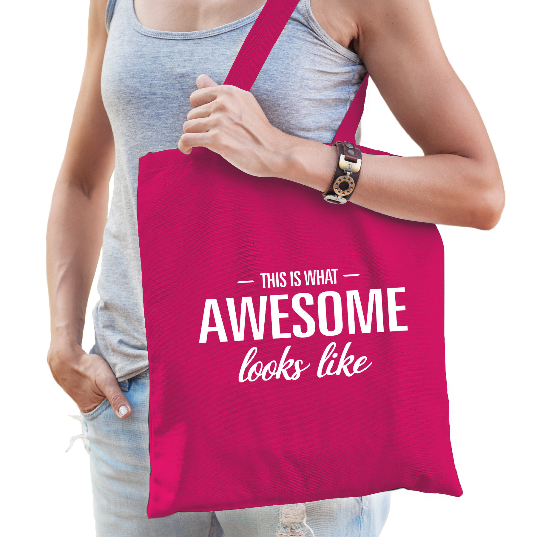 This is what awesome looks like kado katoenen tas roze voor dames. Dit fuchsia roze katoenen tasje is eenzijdig bedrukt met de tekst: This is what Awesome looks like.