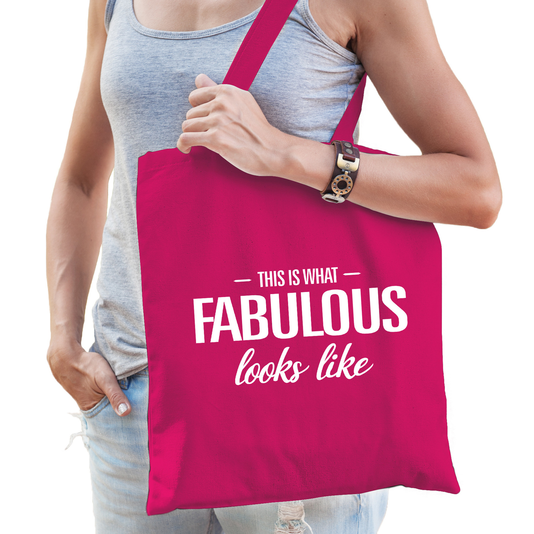 This is what fabulous looks like kado katoenen tas fuchsia roze voor dames. Dit roze katoenen tasje is eenzijdig bedrukt met de tekst: This is what Fabulous looks like.