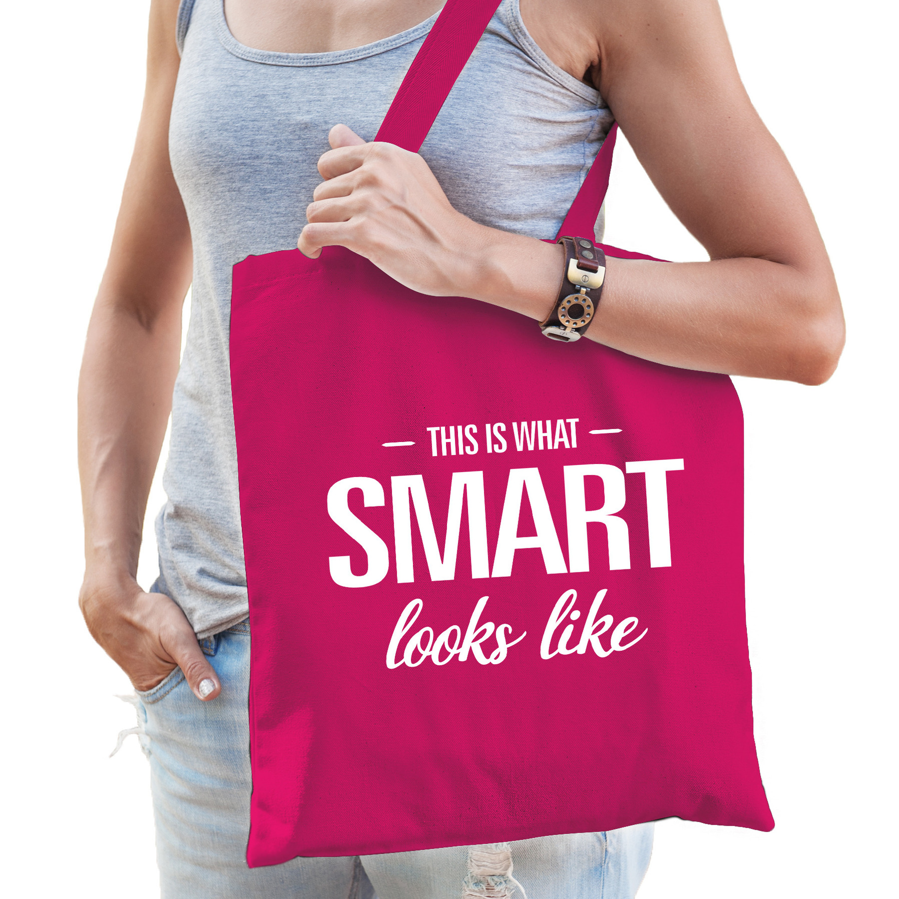 This is what smart looks like kado katoenen tas fuchsia roze voor dames. Dit roze katoenen tasje is eenzijdig bedrukt met de tekst: This is what Smart looks like.
