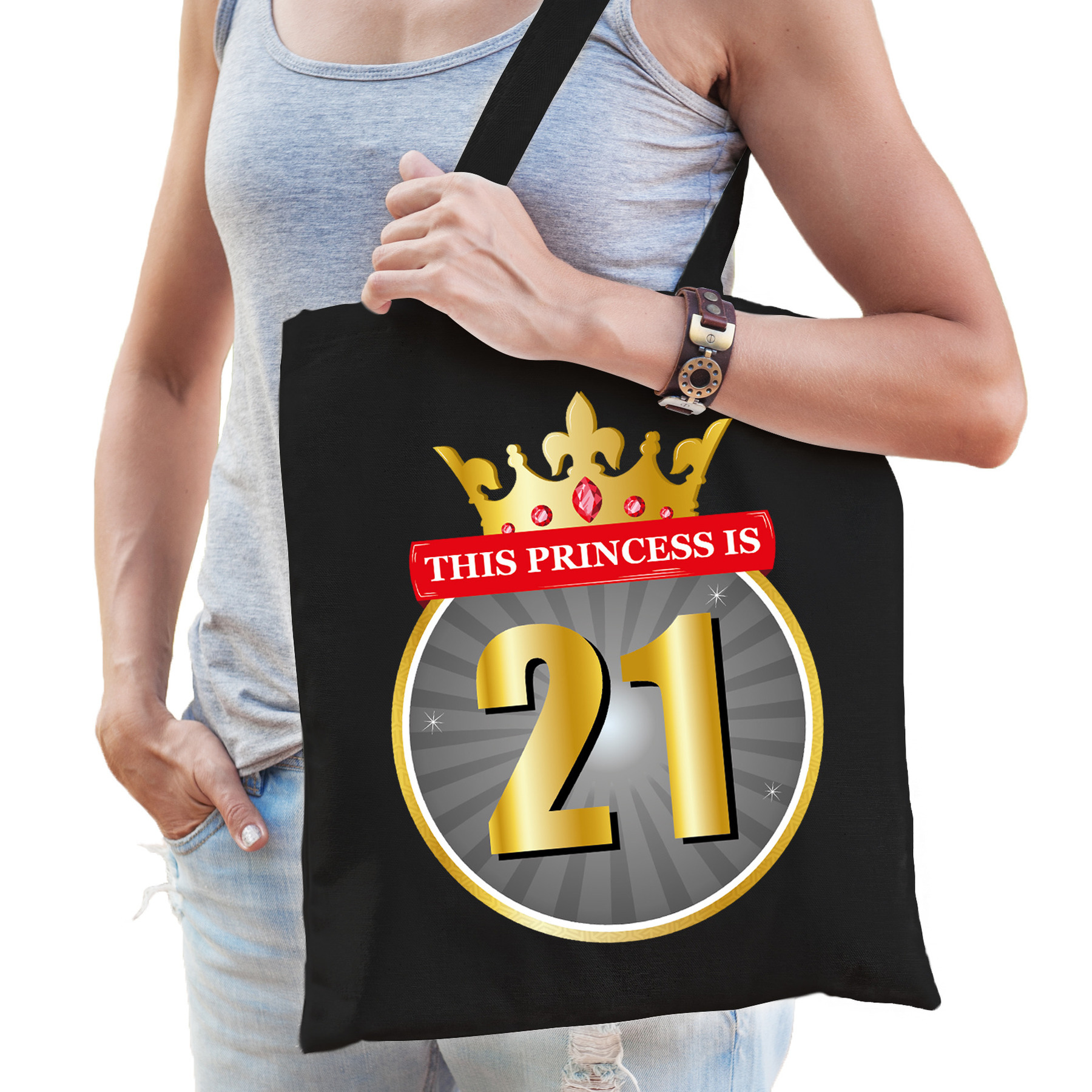 This Princess is 21 katoenen cadeau tas zwart voor dames. Dit zwart katoenen tasje is eenzijdig bedrukt met een kroontje en de tekst: This Princess is 21. Ken jij iemand die binnenkort 21 jaar wordt? Verras haar dan met een fantastische tas. Leuk om cadeau te geven voor een verjaardag of gewoon zomaar!