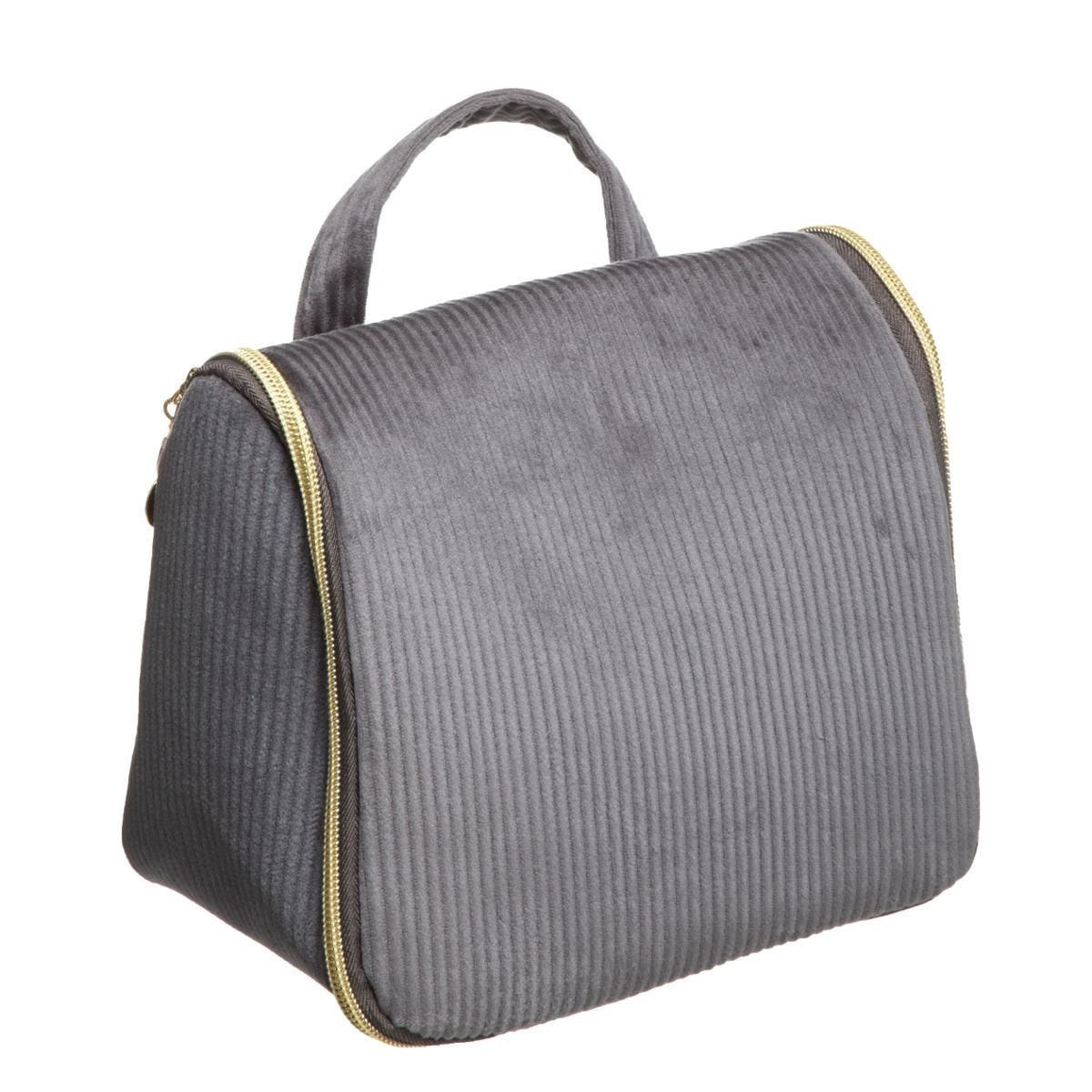 Toilettas/make-up etui/opberg tas ophangbaar ribstof grijs 21 x 12 x 18 cm. Handige toilettas voor op vakantie of op reis, om uw make-up en andere verzorgingsproducten in te bewaren. Materiaal: corduroy. Handbagage reis vakantie accessoires toilettassen/make-up tasjes met ophanghaak.