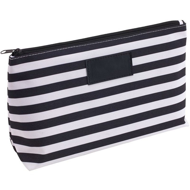Toilettas/reisetui gestreept in de kleuren zwart/wit met kunstlederen detail voor kinderen/heren/dames. De tas heeft een hoofd- en binnenvak met ritssluiting. Afmeting: ca. 28 x 18 x 9,5 cm. Materiaal: polyester. Handbagage reis accessoires toilettassen/make-up tassen.