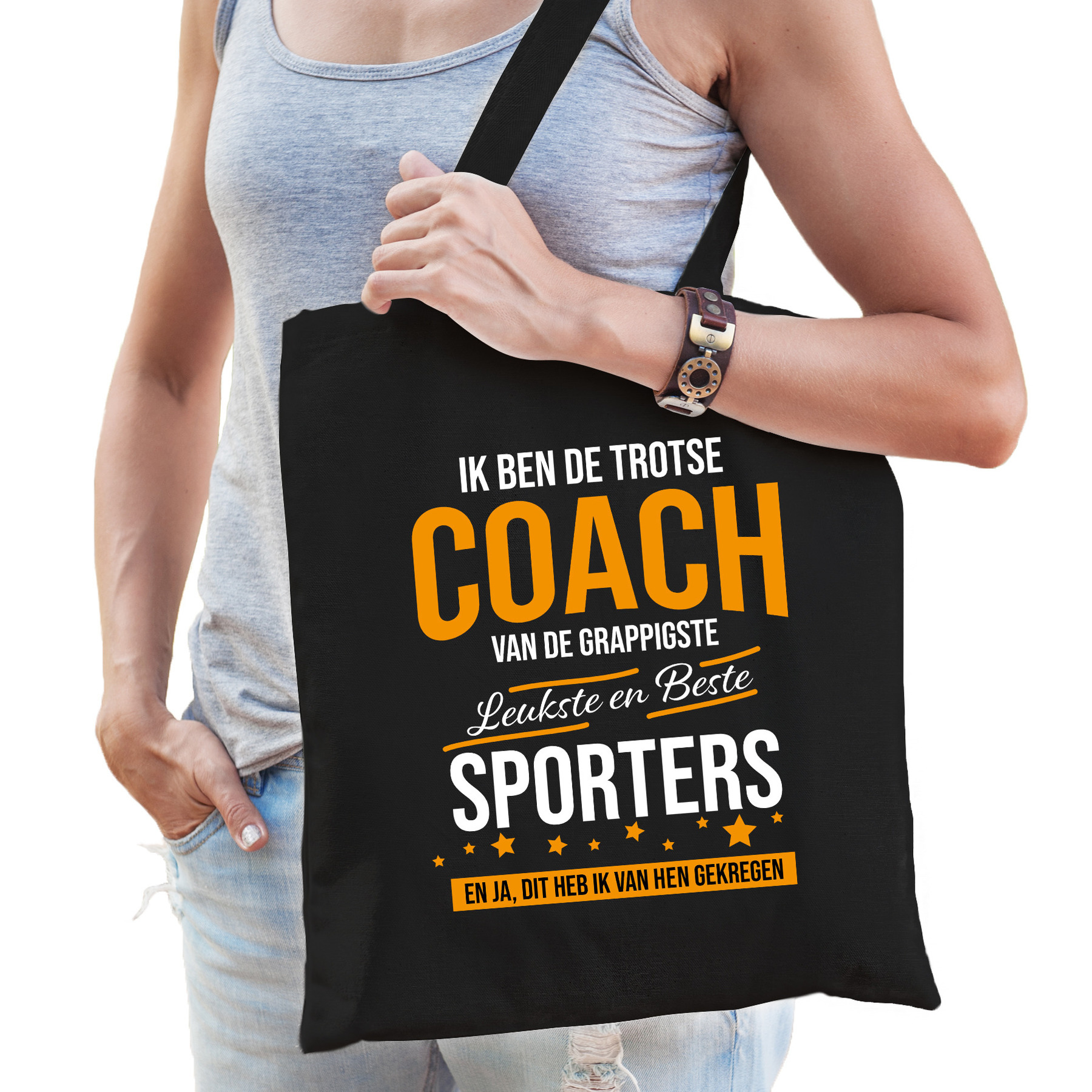Trotse coach van de beste sporters katoenen tasje in het zwart, voor dames. Dit zwarte tasje is eenzijdig bedrukt met oranje en witte letters met de tekst: Ik ben de trotse coach van de grappigste, leukste en beste sporters. En ja, dit heb ik van hen gekregen.