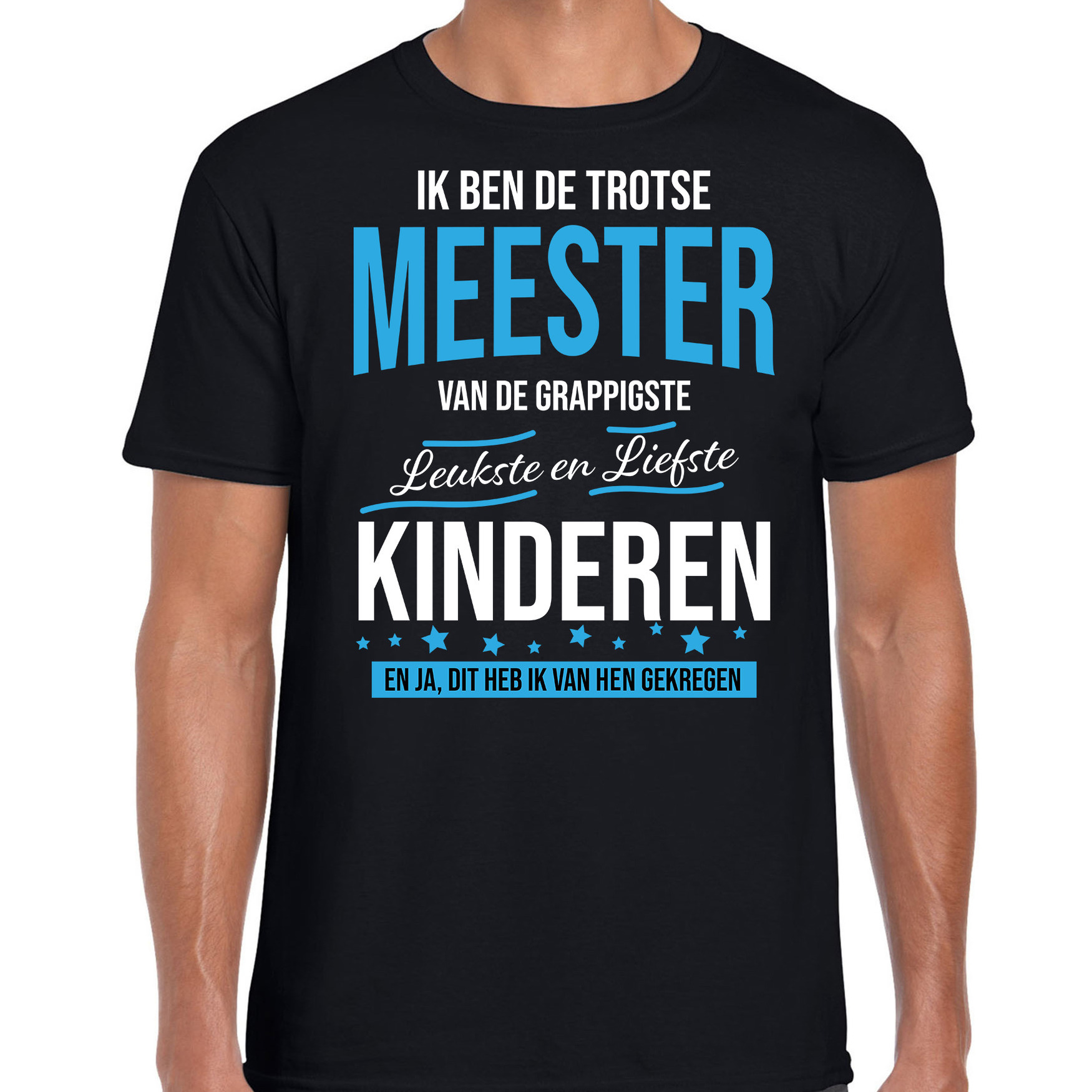 Trotse meester cadeau t-shirt zwart voor heren. Op dit zwarte shirt staat in blauwe en witte letters groot de tekst: Ik ben de trotse meester van de grappigste leukste en liefste kinderen. En ja, dit heb ik van hen gekregen. Cadeau voor meester/leraar/docent/leerkracht/onderwijzer.