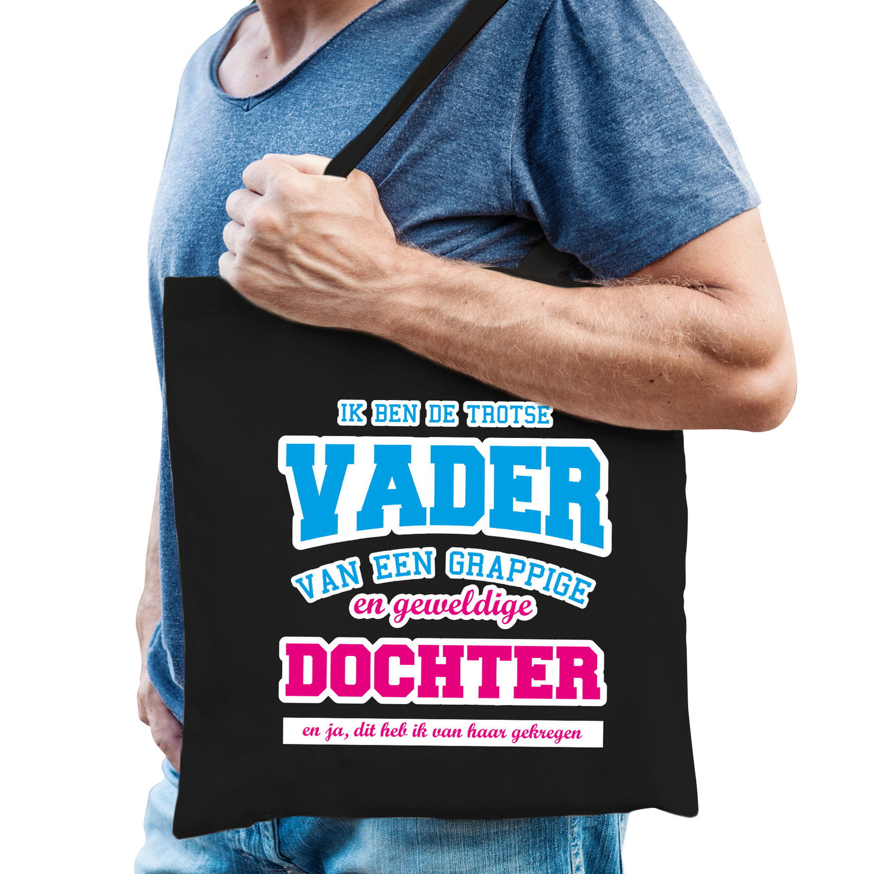 Trotse vader van geweldige dochter cadeau tas zwart voor heren. Op dit zwarte tasje staat in blauwe en roze letters de tekst: Ik ben de trotse vader van een grappige en geweldige dochter en ja, dit heb ik van haar gekregen.
