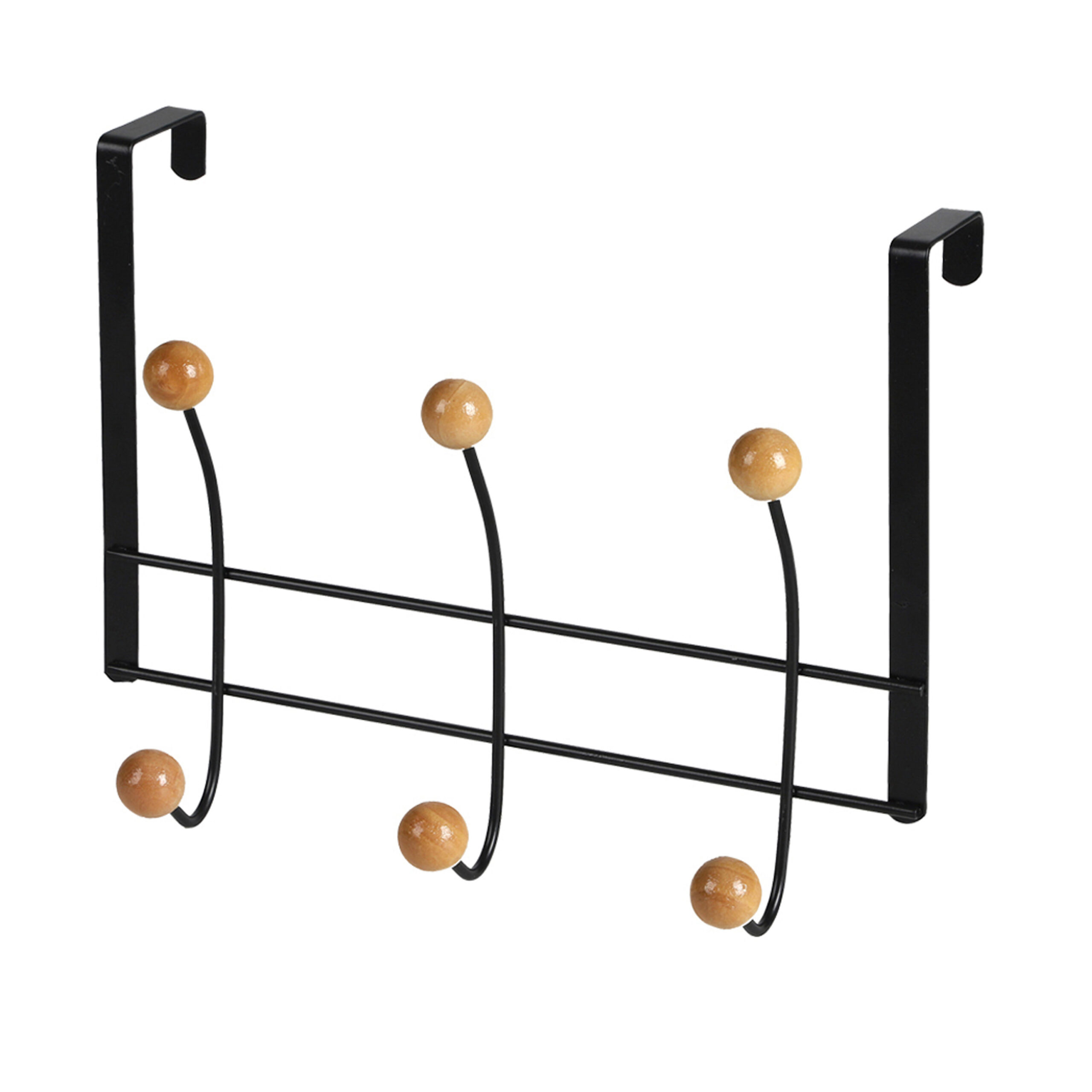 Deurkapstok van metaal met 6 ophangknoppen van hout in de kleur zwart. Organiseer je ruimte effici?nt en stijlvol met deze praktische deurkapstok. Uitgevoerd in een zwarte kleur, biedt deze kapstok met twee ophang knoppen een eenvoudige en effectieve oplossing voor het ophangen van jassen, tassen, handdoeken en meer. Gemaakt van metaal, is deze kapstok stevig en betrouwbaar, ideaal voor dagelijks gebruik in verschillende kamers van je huis. Geschikt voor een stompe deur met een maximale dikte van 4 cm. Afmeting: ca. 19 cm. Materiaal: metaal/hout.