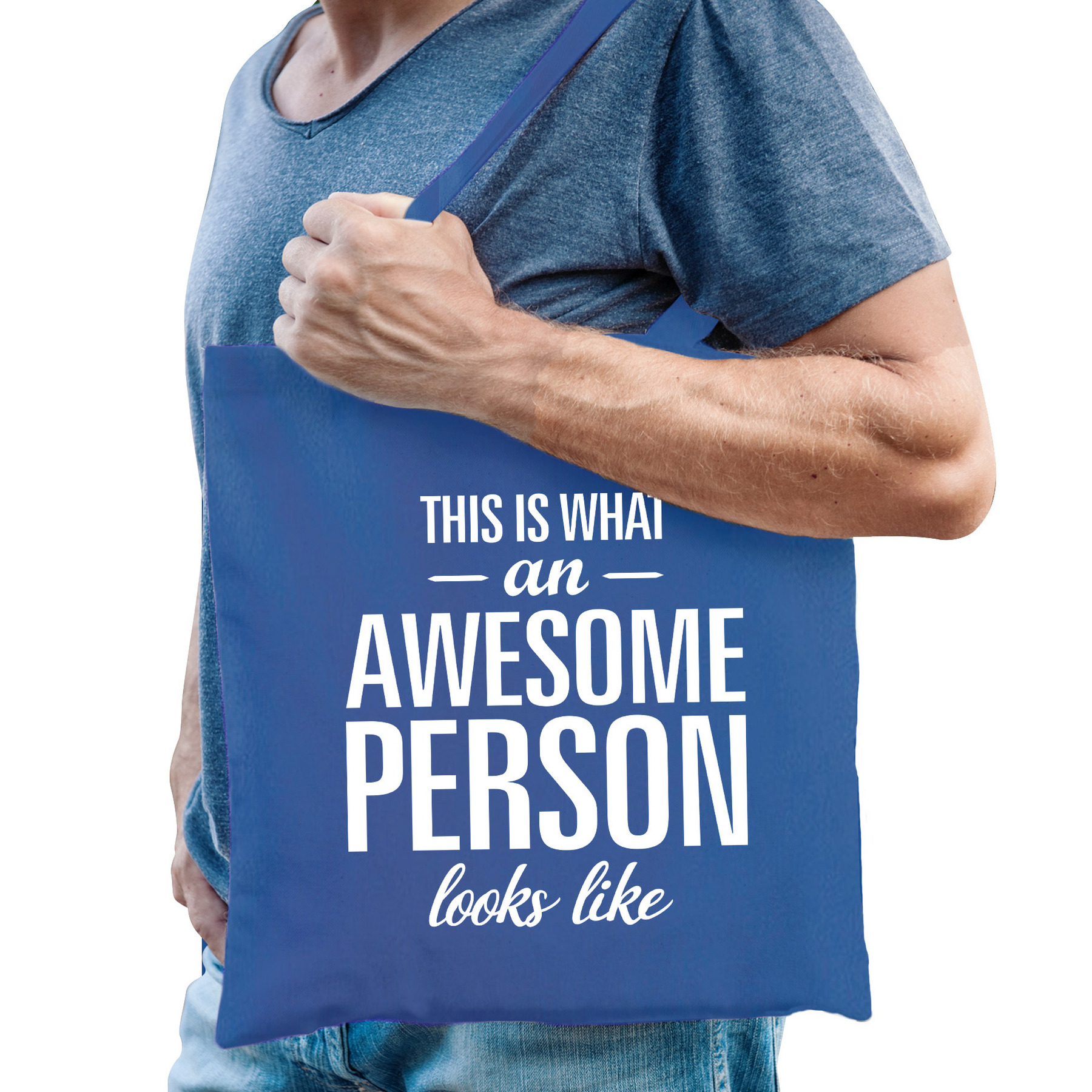 Bellatio Decorations katoenen cadeau tas/shopper/tote bag in de kleur blauw. De shopper is eenzijdig bedrukt met de tekst: This is what an awesome person looks like. Het tasje is leuk om cadeau te geven met een verjaardag of gewoon zomaar. Materiaal: 100% katoen, 140 grams kwaliteit. Formaat vak: ca. 42 x 38 cm. Totale lengte inclusief hengsel: ca. 67 cm. Inhoud: ca. 10 liter.