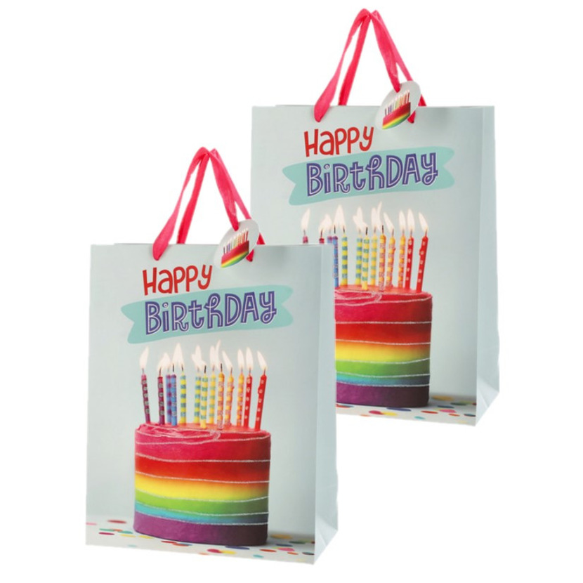 2x papieren verjaardag giftbags/cadeau tasjes met print van een vrolijk gekleurde verjaardagstaart. Het tasje is lekker ruim van formaat: 25 x 32 x 12 cm. Cadeautasjes van papier voor een mooie presentatie van cadeautjes, inclusief naamkaartje/cadeaulabel. Eenzijdig bedrukt met verjaardagstaart print en de tekst Happy Birthday.